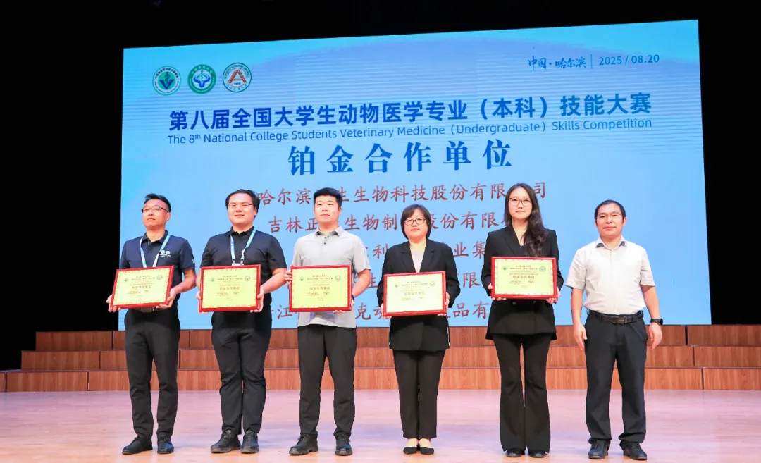 在第八屆全國大學生動物醫學專業(本科)技能大賽閉幕式上,正業生物副總經理程玉紅與多家企業代表共同為二等獎獲獎選手頒獎。隨后,正業生物被組委會授予“鉑金合作單位”稱號。