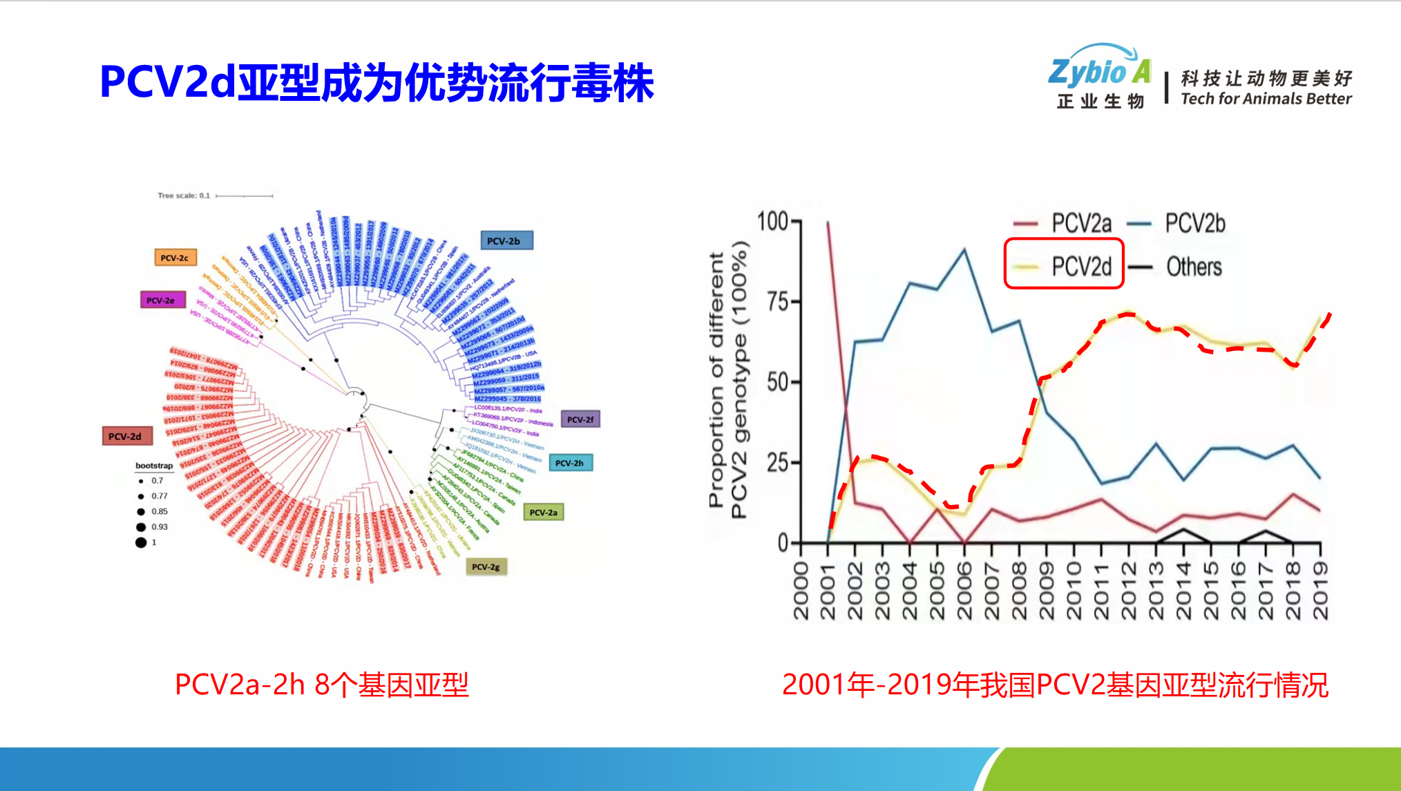 7月19日,正業(yè)生物技術(shù)與市場(chǎng)部總監(jiān)王紅巖分享了題為《慢性消化道疾病對(duì)育肥成本的影響》的報(bào)告,他指出慢性消化道疾病因其癥狀隱蔽、病程長(zhǎng)等特點(diǎn),已成為影響?zhàn)B殖效益的重要隱患,尤其是豬支原體、豬圓環(huán)病毒感染對(duì)豬群生長(zhǎng)性能及經(jīng)濟(jì)效益的重大影響。報(bào)告中用詳實(shí)的數(shù)據(jù)分析了豬圓環(huán)病毒流行態(tài)勢(shì)、監(jiān)測(cè)數(shù)據(jù)以及防控案例。從近年來(lái)的檢測(cè)數(shù)據(jù)可以看出,PCV2d亞型已成為絕對(duì)優(yōu)勢(shì)流行毒株,其致病性與傳播力顯著高于PCV2a、PCV2b亞型,與PRRS混合感染表現(xiàn)出更嚴(yán)重的臨床癥狀、更低的平均日增重、更高水平的 PCV2病毒血癥以及更嚴(yán)重的淋巴病變等。