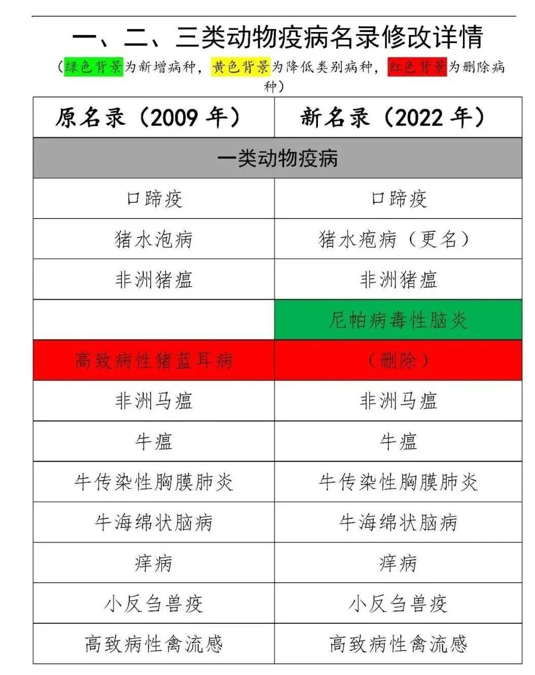 《一、二、三類動物疫病病種名錄》2009版與2022版對比詳情如下: