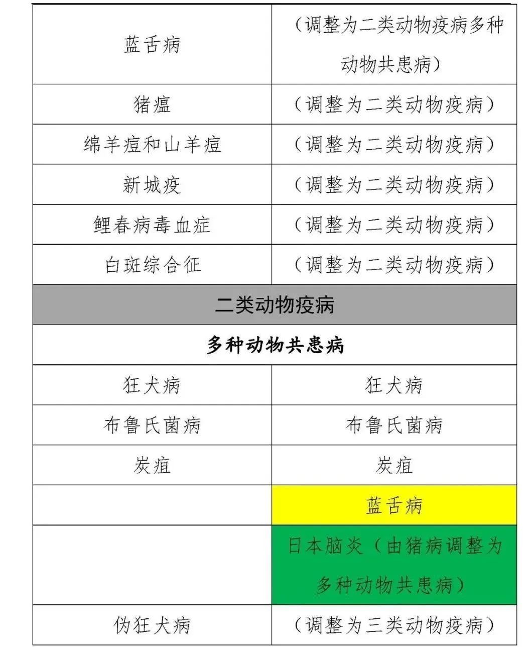 多種動物共患病(7種):狂犬病、布魯氏菌病、炭疽、藍舌病、日本腦炎、棘球蚴病、日本血吸蟲病