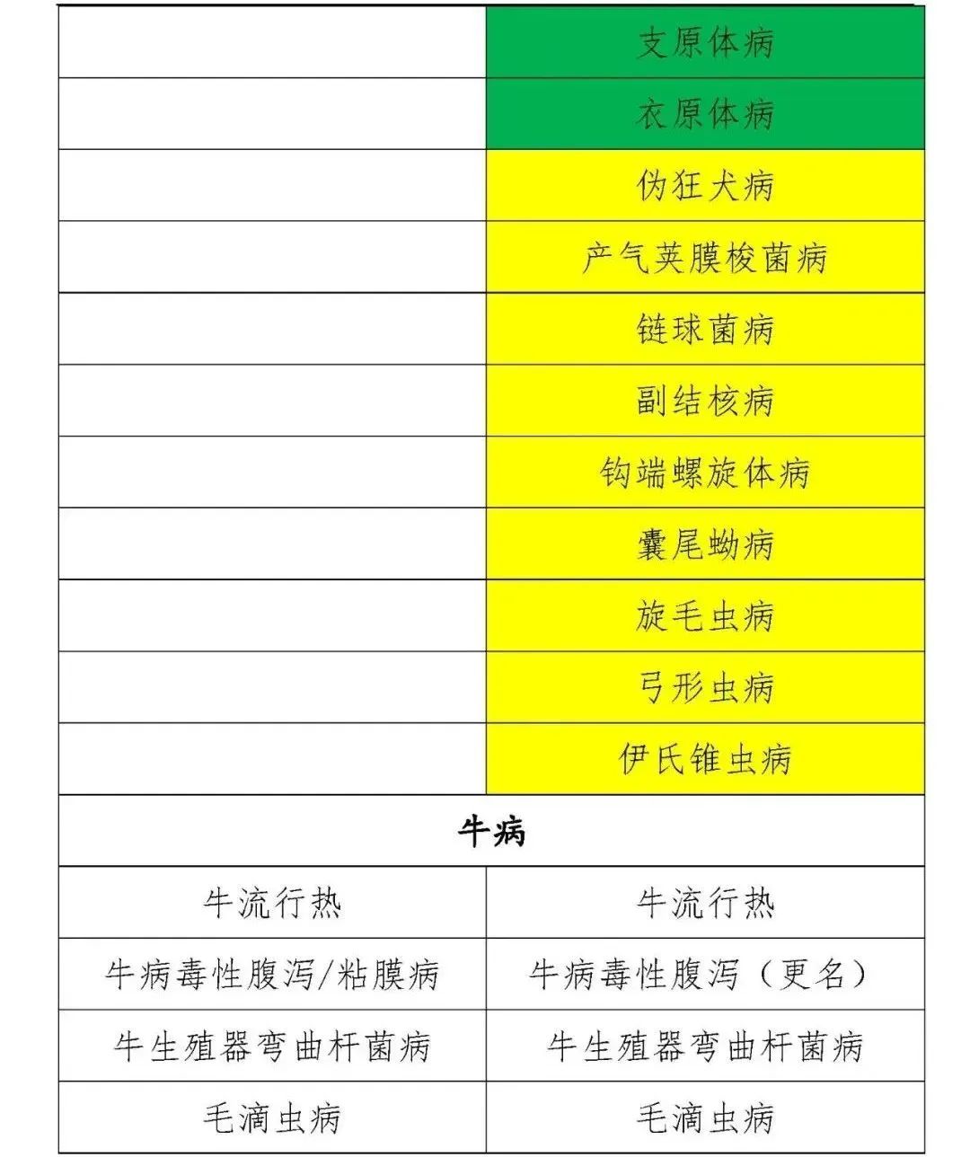 牛病(10種):牛病毒性腹瀉、牛惡性卡他熱、地方流行性牛白血病、牛流行熱、牛冠狀病毒感染、牛赤羽病、牛生殖道彎曲桿菌病、毛滴蟲病、牛梨形蟲病、牛無漿體病