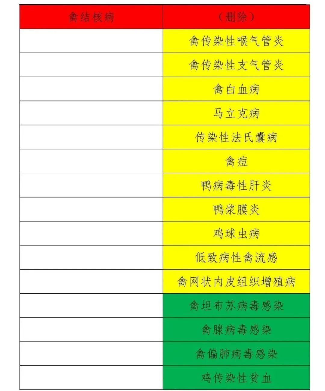 禽病(21種):禽傳染性喉氣管炎、禽傳染性支氣管炎、禽白血病、傳染性法氏囊病、馬立克病、禽痘、鴨病毒性肝炎、鴨漿膜炎、雞球蟲病、低致病性禽流感、禽網狀內皮組織增殖病、雞病毒性關節炎、禽傳染性腦脊髓炎、雞傳染性鼻炎、禽坦布蘇病毒感染、禽腺病毒感染、雞傳染性貧血、禽偏肺病毒感染、雞紅螨病、雞壞死性腸炎、鴨呼腸孤病毒感染