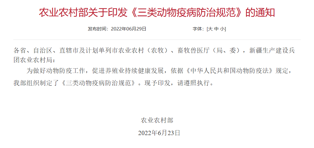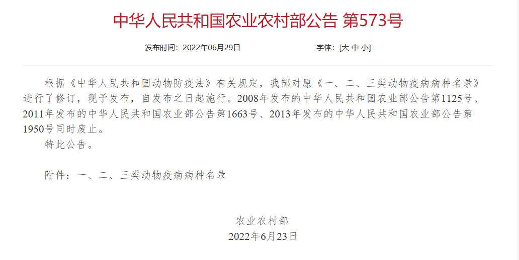 農業農村部發布新版《一、二、三類動物疫病病種名錄》及《三類動物疫病防治規范》+ 查看更多