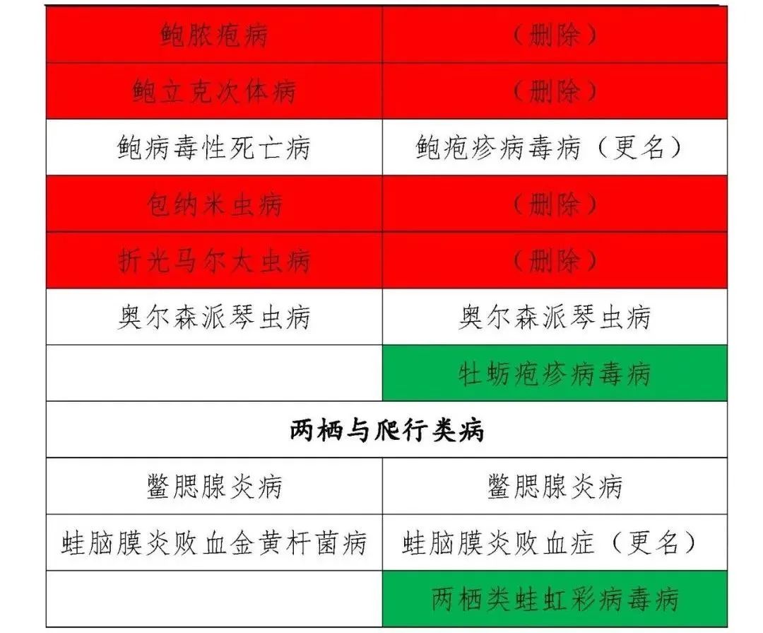 魚類病(11種):鯉春病毒血癥、草魚出血病、傳染性脾腎壞死病、錦鯉皰疹病毒病、刺激隱核蟲病、淡水魚細菌性敗血癥、病毒性神經壞死病、傳染性造血器官壞死病、流行性潰瘍綜合征、鯽造血器官壞死病、鯉浮腫病