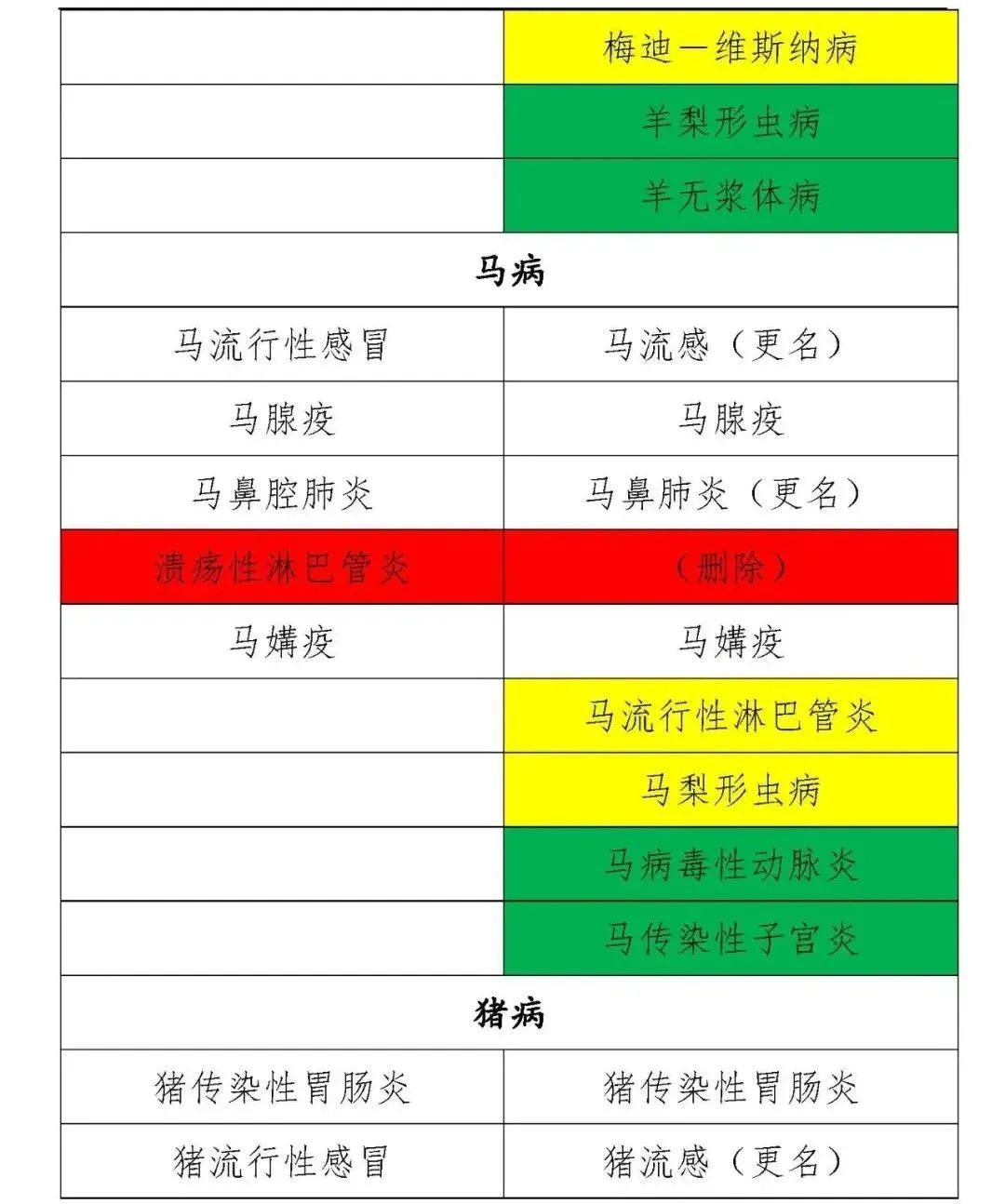 馬病(8種):馬流行性淋巴管炎、馬流感、馬腺疫、馬鼻肺炎、馬病毒性動脈炎、馬傳染性子宮炎、馬媾疫、馬梨形蟲病