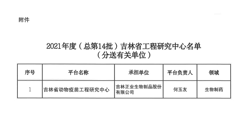 近日,吉林省發展和改革委《關于認定2021年度(總第14批)吉林省工程研究中心的通知》下發,由國家級高新技術企業吉林正業生物制品股份有限公司獨家發起建設的“吉林省動物疫苗工程研究中心”正式獲得認定。