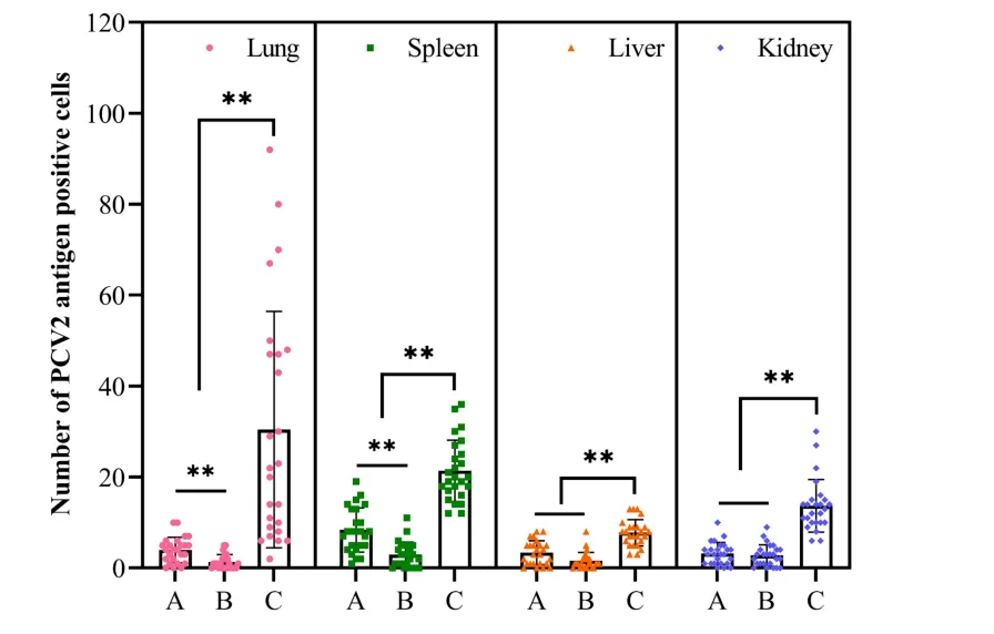 在PCV2感染后14天,通過免疫組化染色檢測了小鼠不同組織的病變(見圖4)和病毒抗原(見圖5)。感染對照組小鼠的脾臟、肺、腎臟和肝臟中觀察到大量PCV2抗原陽性細(xì)胞,而E. coli-Cap或Bac-Cap蛋白免疫的小鼠中這些組織中的陽性細(xì)胞數(shù)量極少。Bac-Cap組的抗原陽性細(xì)胞計數(shù)低于E. coli-Cap組,特別是在肺和脾臟中顯著減少(見圖6)。
