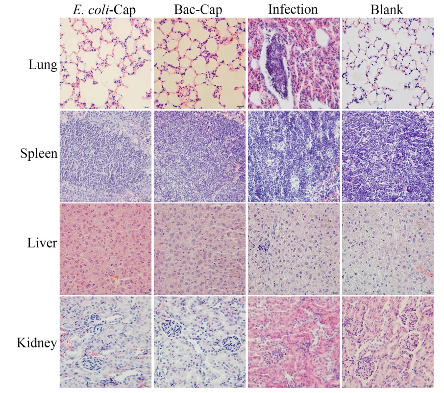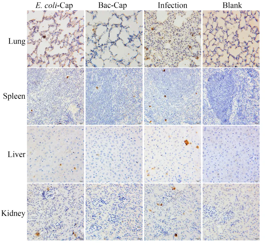 在PCV2d病毒攻毒后,與E. coli-Cap免疫的小鼠相比,Bac-Cap免疫的小鼠體內(nèi)IL-10水平顯著降低,這表明Bac-Cap免疫能夠更有效地抑制IL-10的分泌,減輕了炎癥反應(yīng),從而可能增強(qiáng)機(jī)體的免疫應(yīng)答。此外,Bac-Cap免疫組小鼠的組織病理損傷和PCV2抗原陽性細(xì)胞數(shù)量均顯著減少,這進(jìn)一步證實了Bac-Cap在誘導(dǎo)保護(hù)性免疫方面的優(yōu)勢。