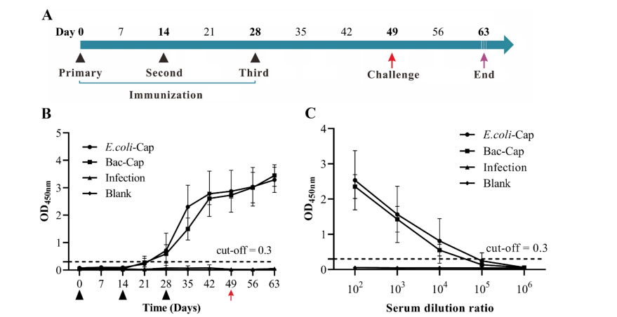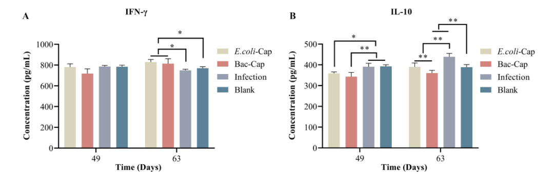 通過ELISA在第三次免疫后21天和PCV2感染后14天測量了血清中IFN-γ和IL-10的濃度。與感染對照組或空白對照組相比,E. coli-Cap組和Bac-Cap組的IL-10水平在免疫后顯著下降。感染后,兩組的IFN-γ水平均顯著增加,而IL-10水平在Bac-Cap組中顯著降低,見圖3。