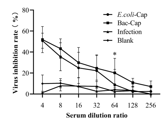 使用基于ELISA的中和試驗檢測血清的抗PCV2中和活性。第三次免疫后21天,E. coli-Cap組和Bac-Cap組小鼠的血清能夠抑制PCV2在PK-15細(xì)胞中的增殖,其中Bac-Cap組在1:64的血清稀釋度下病毒抑制率達(dá)到20.2%,而E. coli-Cap組沒有抑制作用,表明Sf9細(xì)胞表達(dá)的Bac-Cap蛋白能夠刺激更高水平的抗PCV2中和抗體,見圖2。