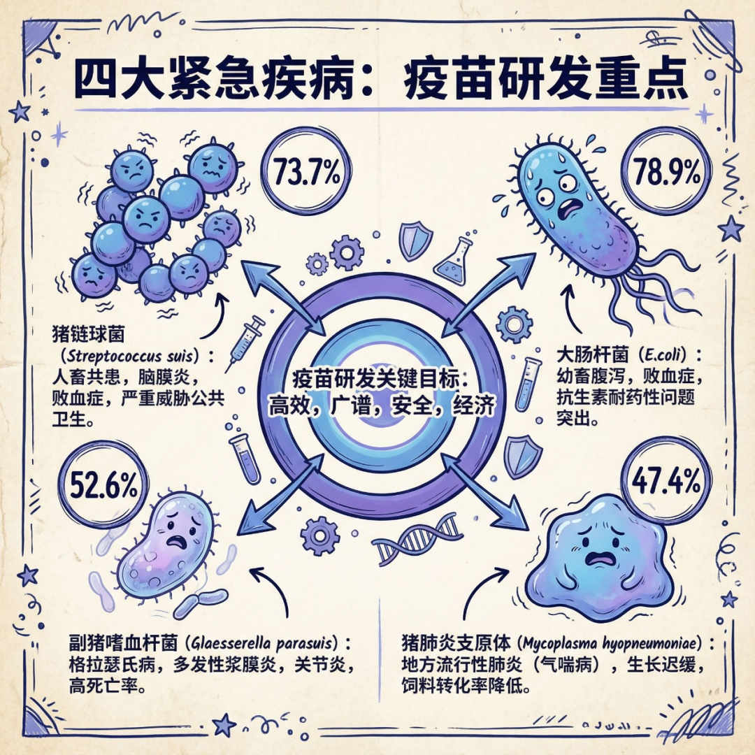 關鍵理由/證據:超過半數的獸醫將這四種疾病列為優先級最高的疫苗研發目標:大腸桿菌(78.9%)、鏈球菌(73.7%)、副豬嗜血桿菌(52.6%)、支原體(47.4%)。這些疾病不僅發病率高,而且現有防控手段高度依賴抗生素。