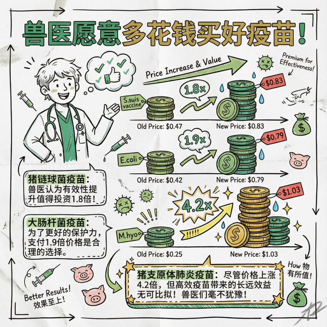 關鍵理由/證據:調查顯示,獸醫愿意為理想的鏈球菌疫苗支付 1.8 倍價格(從升至0.83),大腸桿菌疫苗 1.9 倍(從升至0.79),而支原體疫苗更是高達 4.2 倍(從升至1.03)。這種支付意愿的巨大差異揭示了不同疾病的經濟影響和根除潛力。